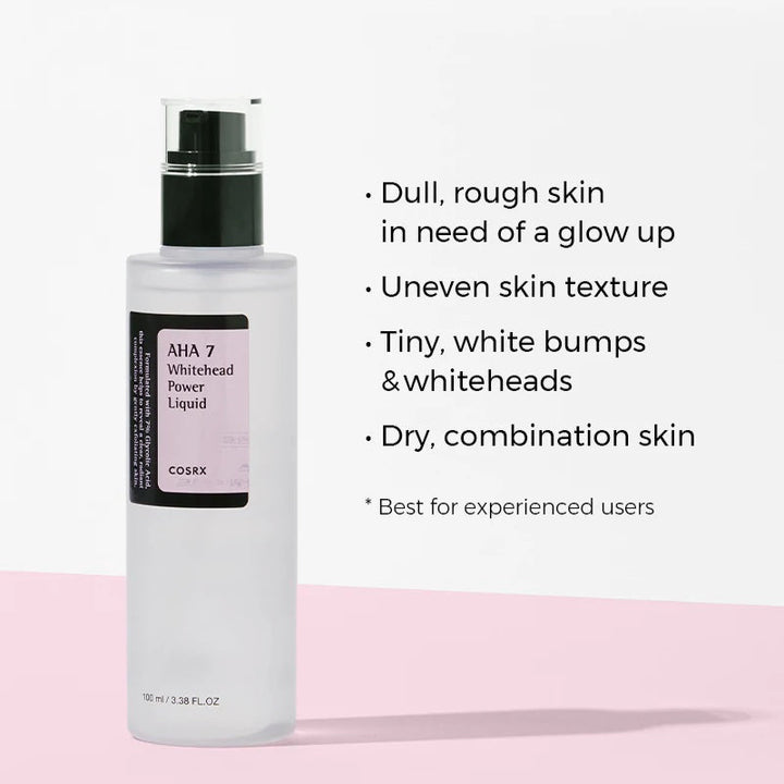 El líquido exfoliante suave es perfecto para las pieles secas o mixtas: el AHA exfolia, mientras que el ácido hialurónico hidrata.
