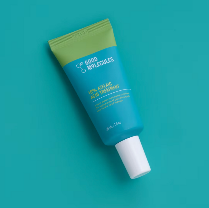 El tratamiento con ácido azelaico al 10 % es una crema de ácido azelaico puro de Good Molecules que reduce la aparición de manchas postacné y calma el enrojecimiento facial.