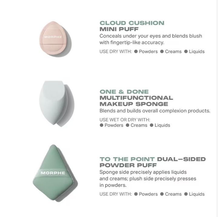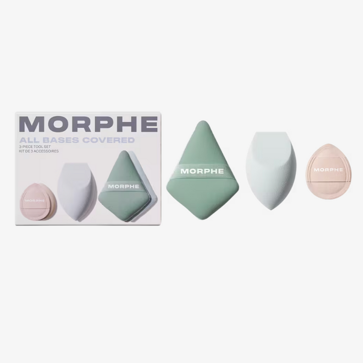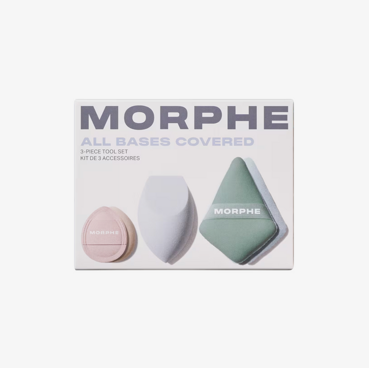 Dale forma a tu rutina de maquillaje con el Set de 3 Herramientas All Bases Covered de Morphe. Este trío de herramientas exclusivas de Morphe incluye una esponja multifuncional y dos borlas de precisión para aplicar, modelar y difuminar fácilmente todos tus productos faciales, desde la base hasta los polvos fijadores.