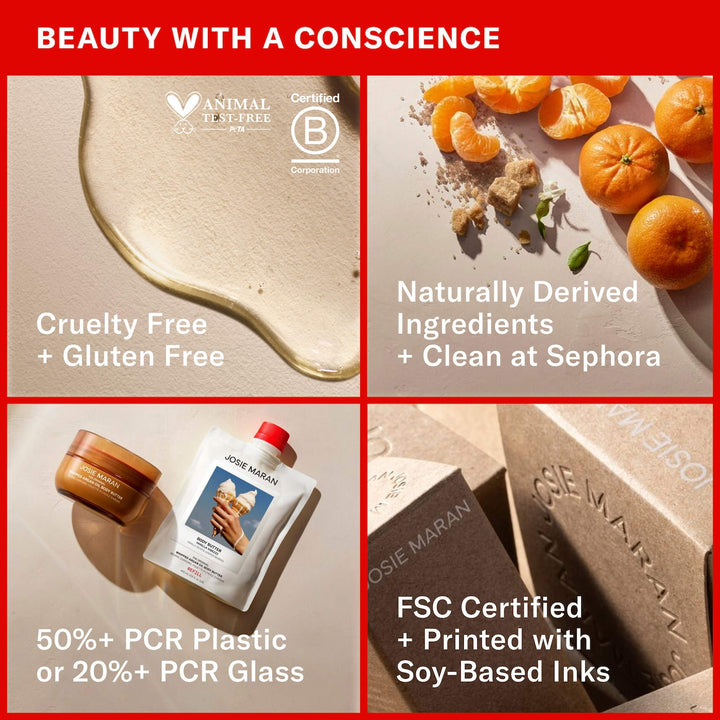 Esta colección limitada para un cutis radiante proporciona una piel hidratada, visiblemente firme y luminosa con mantecas corporales de argán batidas al aire en Vanilla Vibezzz con vainilla y bayas de enebro, Topless Tangerine con mandarina pixie y pomelo rosa, y Golden Hour con ámbar y almizcle blanco. Regálalo o quédatelo: tu luminosidad, tus reglas.