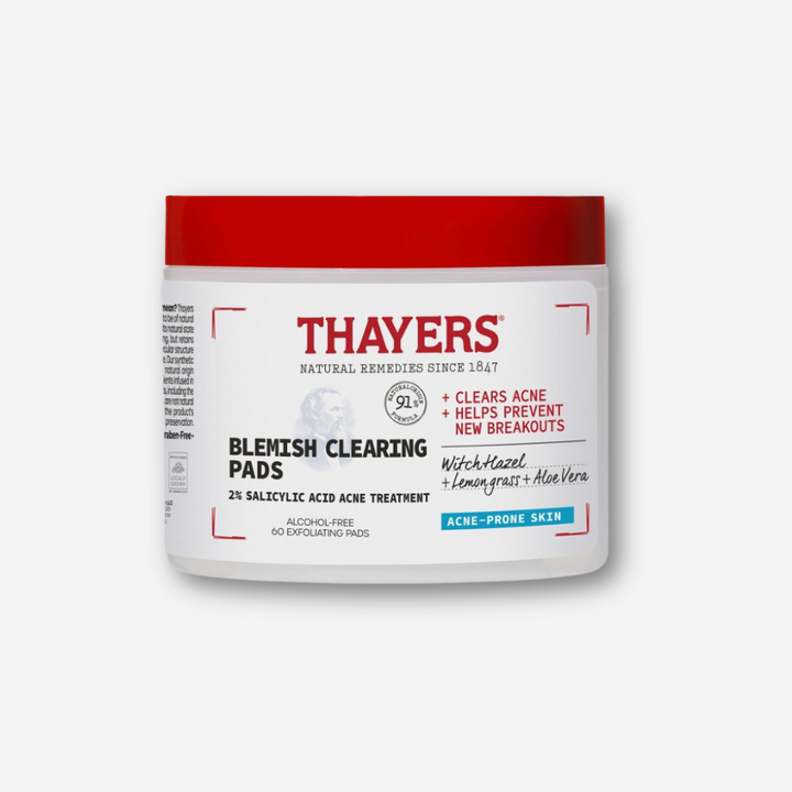 ¡Adiós a las imperfecciones! Las almohadillas THAYERS Blemish Clearing Acne Treatment Pads no contienen alcohol y dejan la piel renovada, calmada e hidratada. Con un 2% de ácido salicílico de máxima potencia, nuestra fórmula ayuda a eliminar las imperfecciones del acné, los puntos negros y los puntos blancos y ayuda a prevenir la formación de otros nuevos. Formulado con aceite de árbol de té y la mezcla patentada de Thayers de Aloe Vera y Witch Hazel no destilada que se cultiva exclusivamente para Thayers en una granja familiar en el condado de Fairfield, Connecticut. Los productos Thayers han sido un accesorio en los botiquines para las generaciones- una vez que los utilice usted sabrá por qué.