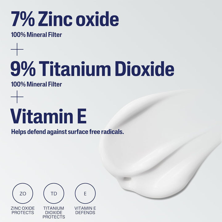 Formulado con una combinación de óxido de zinc puro y dióxido de titanio con prebióticos y vitamina E calmante para ayudar a proteger la piel de los radicales libres de la superficie