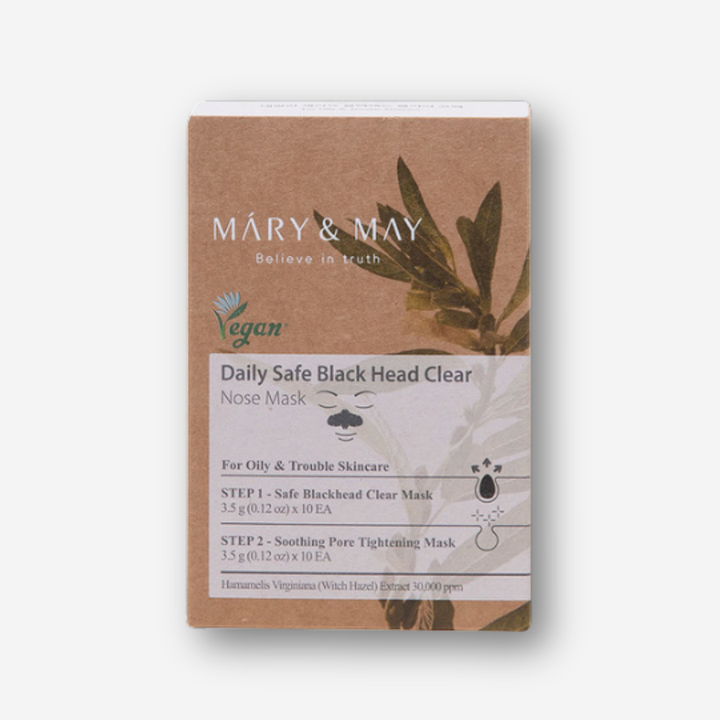 Mary & May Daily Safe Blackhead Clear Nose Pack derrite suavemente los puntos negros durante 10 minutos. Daily Safe Blackhead Clear Nose Pack está certificado para veganos, selecciona sólo ingredientes no irritantes de grado verde EWG como el hamamelis y el extracto de corteza de sauce blanco para disolver suavemente las células muertas de la piel y los puntos negros para descargar los residuos fuera de los poros. Después de eliminar los puntos negros, los extractos de centella asiática, houttuynia cordata y árbol del té calman los poros y utilizan péptidos e ingredientes activos de adenosina generosamente para cerrar los poros y dar elasticidad para reducir fundamentalmente los puntos negros.