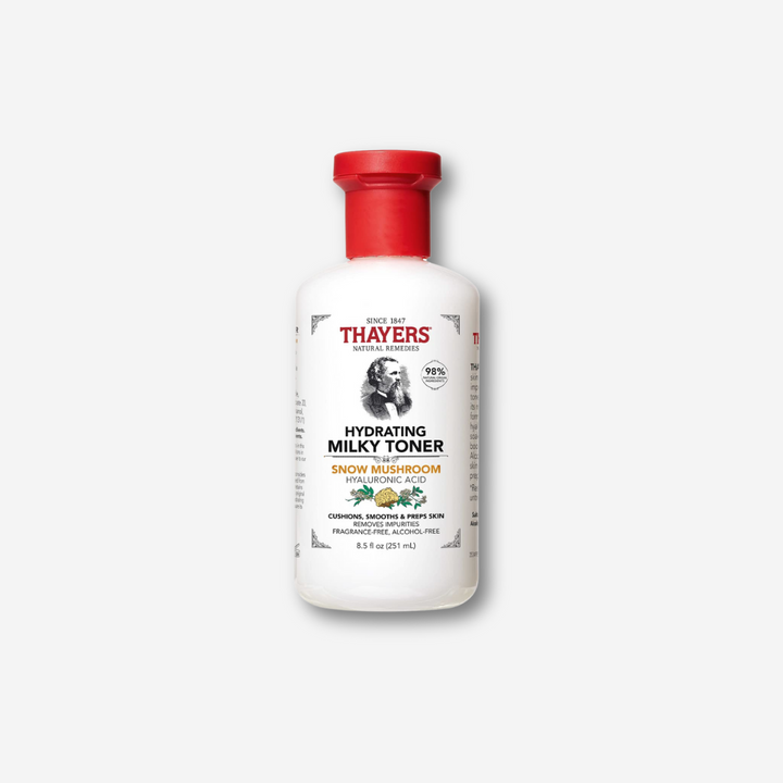 Thayers Milky Hydrating Face Toner con Snow Mushroom y Ácido Hialurónico proporciona 48 horas de hidratación dejando la piel suave, amortiguada e hidratada. Sin alcohol y apto para pieles sensibles.
