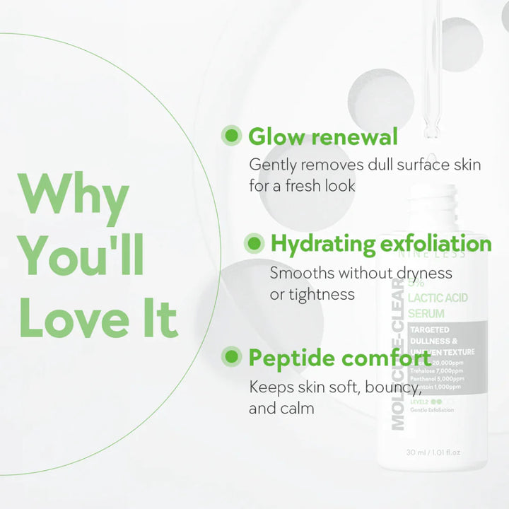 Renovación que potencia el brillo: el ácido láctico suaviza las zonas ásperas y favorece la renovación celular suave, revelando una tez más luminosa y uniforme.