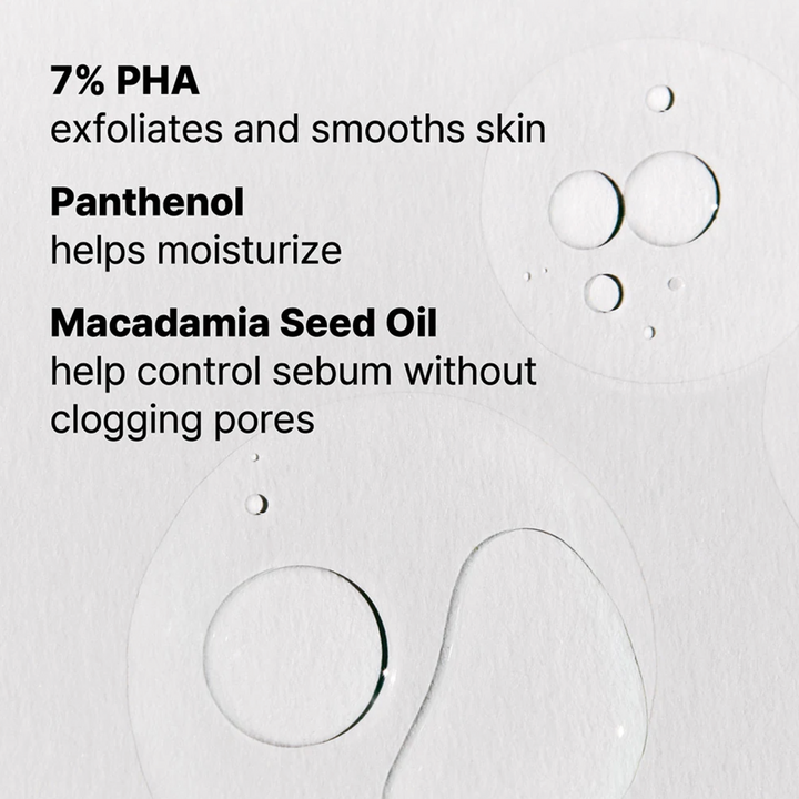 PHA, un exfoliante químico con un tamaño molecular grande que no penetra tan profundamente en la piel, lo que hace que este ácido sea una mejor opción para las pieles sensibles que los AHA y los BHA. Pantenol para ayudar a hidratar y aceite de semilla de macadamia para ayudar a controlar el sebo sin obstruir los poros.