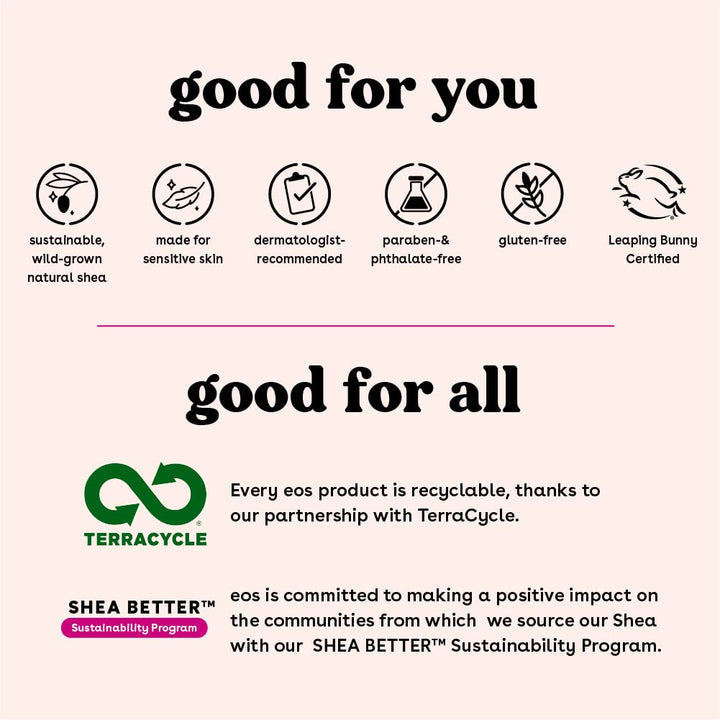 Ingredientes sostenibles: los bálsamos labiales eos tienen manteca de karité y aceite 100% natural de origen silvestre, de origen sostenible, para dejar tus labios suaves y nutridos