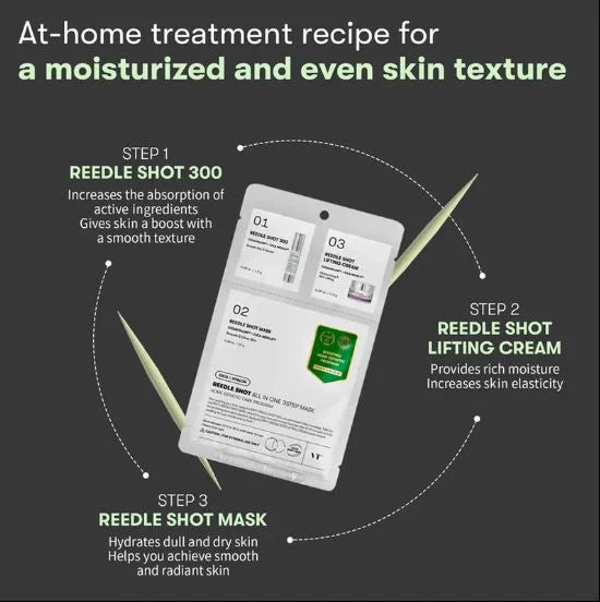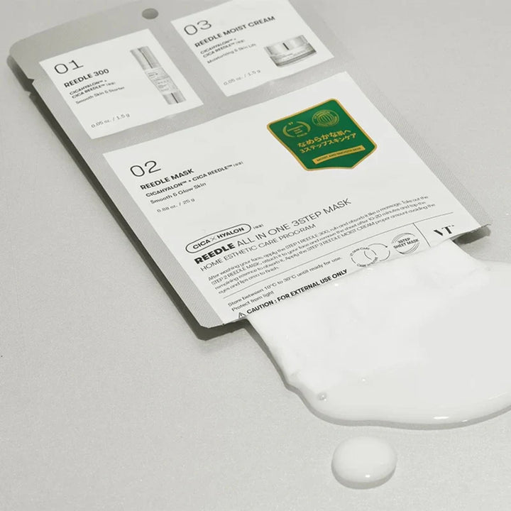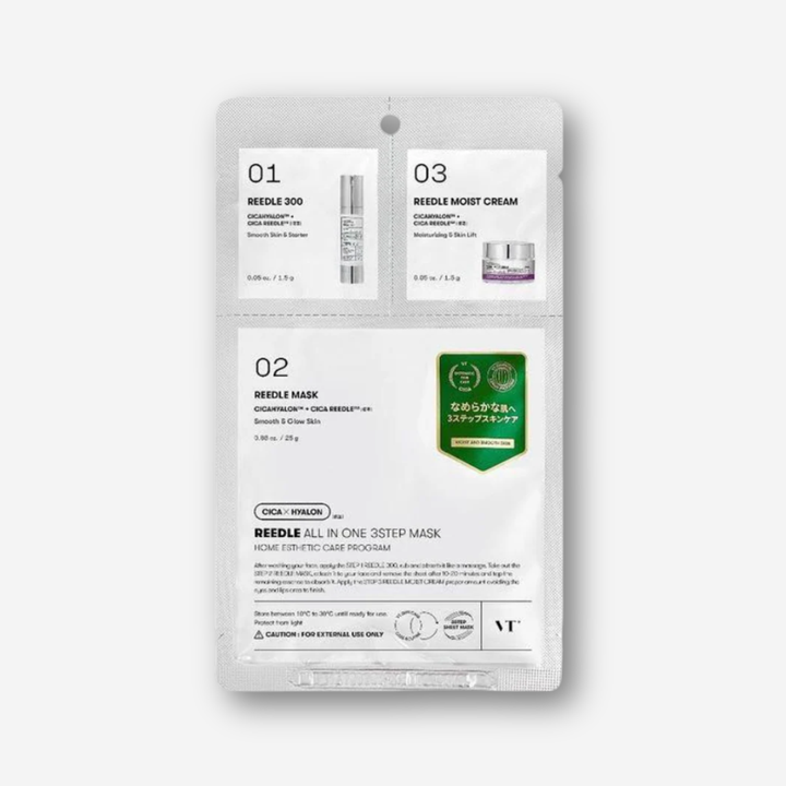 La mascarilla Reedle Shot All In One 3 Step Mask de VT está diseñada para proporcionar hidratación y elasticidad en profundidad a la piel. Cada paso contiene CICA REEDLE™ de VT, compuesto por partículas minerales de tamaño microscópico que imitan los tratamientos con microagujas para ayudar a que los ingredientes se absorban más profundamente en la piel.