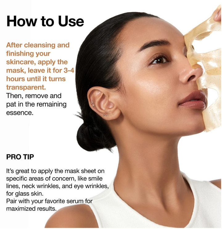 Mascarilla de hidrogel con 70 % agua de arroz, colágeno de 300 Da y ceramida NP. Refuerza la barrera cutánea, mejora la elasticidad y aporta luminosidad tipo “glass skin” en solo 3–4 h.