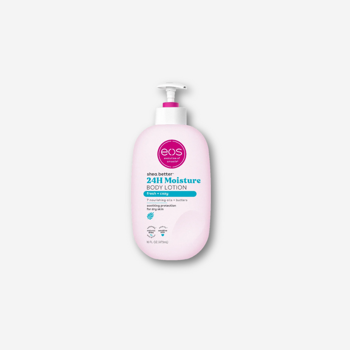 - LOCIÓN CORPORAL SHEA BETTER: Nuestra loción corporal Fresh & Cozy se siente como la luz de la mañana: cassis húmedo y almizcle puro. La loción corporal eos 24-hour hydration está elaborada con ingredientes naturales para dejar su piel suave de la cabeza a los pies.