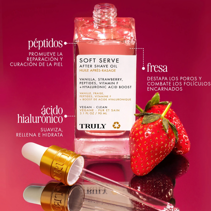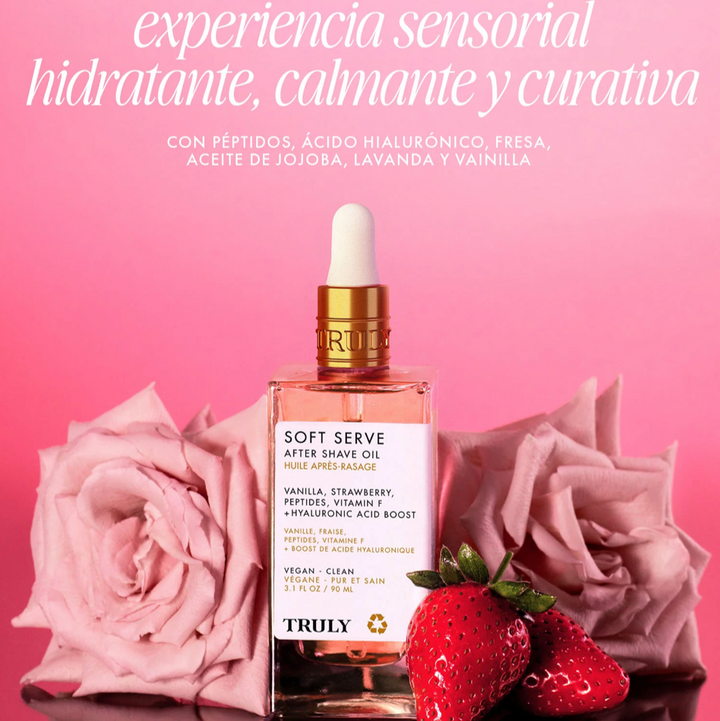 Ahórrese el dolor de la irritación de la cuchilla y los pelos enquistados con el aceite para después del afeitado Soft Serve de Truly. Formulado con una preciosa mezcla de péptidos, ácido hialurónico y fresa para exfoliar suavemente, hidratar y acelerar el proceso de curación de la piel.
