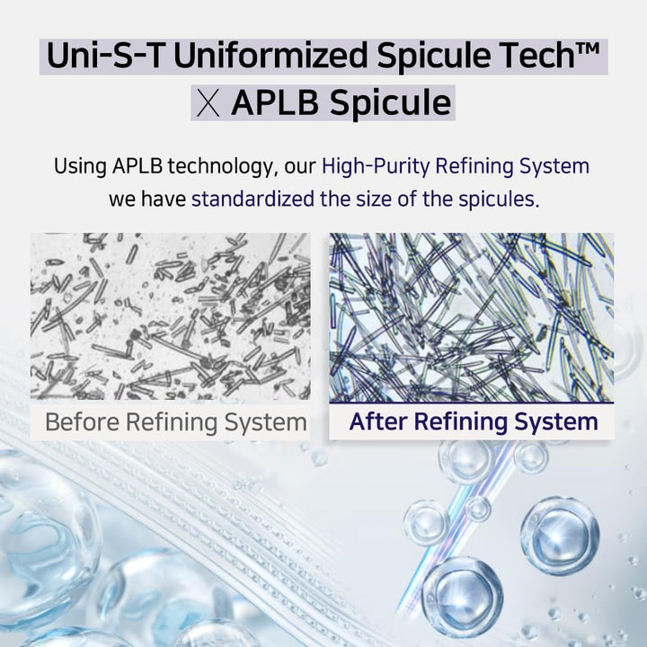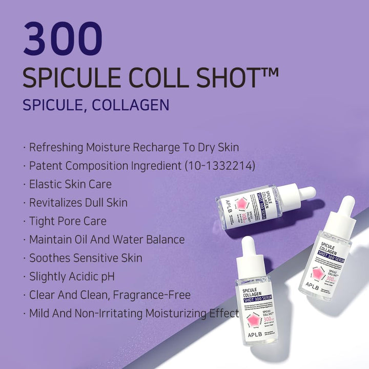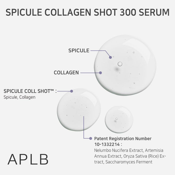 Spicule Collagen Shot 300 Serum de APLB es un suero facial intensivo que combina espículas naturales (microagujas marinas, también llamadas spicules) con colágeno hidrolizado para mejorar la textura de la piel, aumentar la firmeza y ofrecer hidratación profunda.