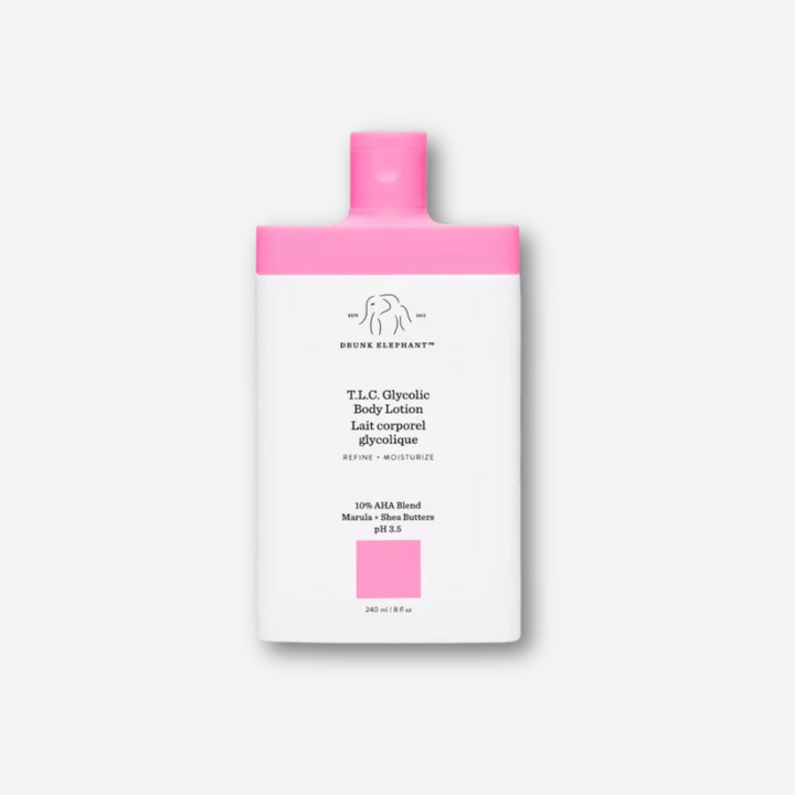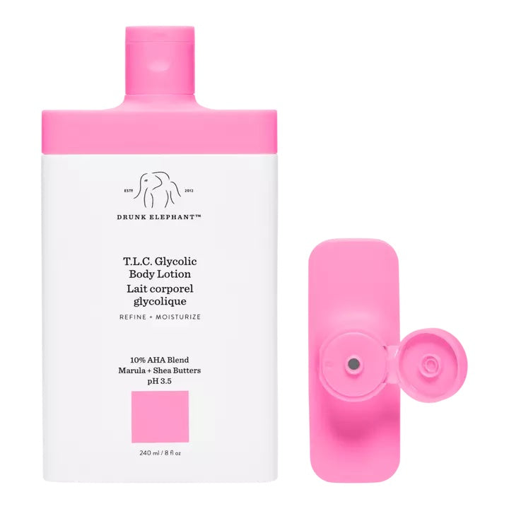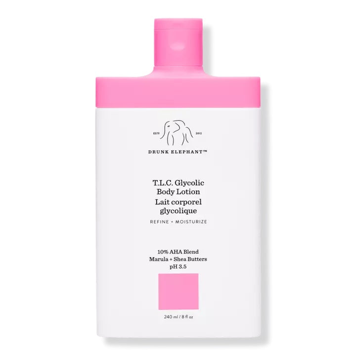 La loción corporal T.L.C. Glycolic Body Lotion de Drunk Elephant contiene una mezcla sobrecargada de AHA al 10% que exfolia suavemente para restaurar y rejuvenecer las zonas apagadas e irregulares, mientras que su mezcla de aceites vegetales calmantes, mantecas profundamente hidratantes y electrolitos que actúan como barrera reponen la piel seca y deshidratada de debajo del cuello.