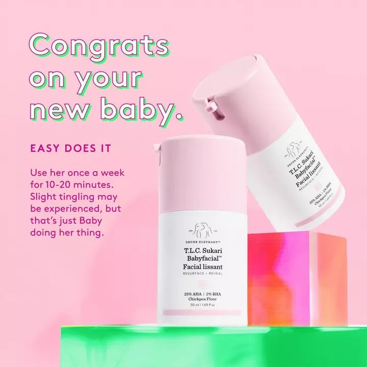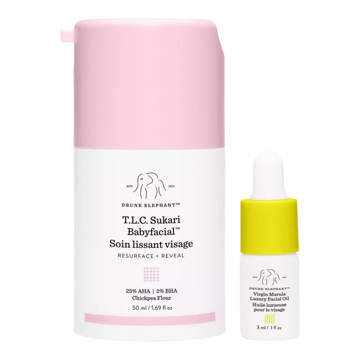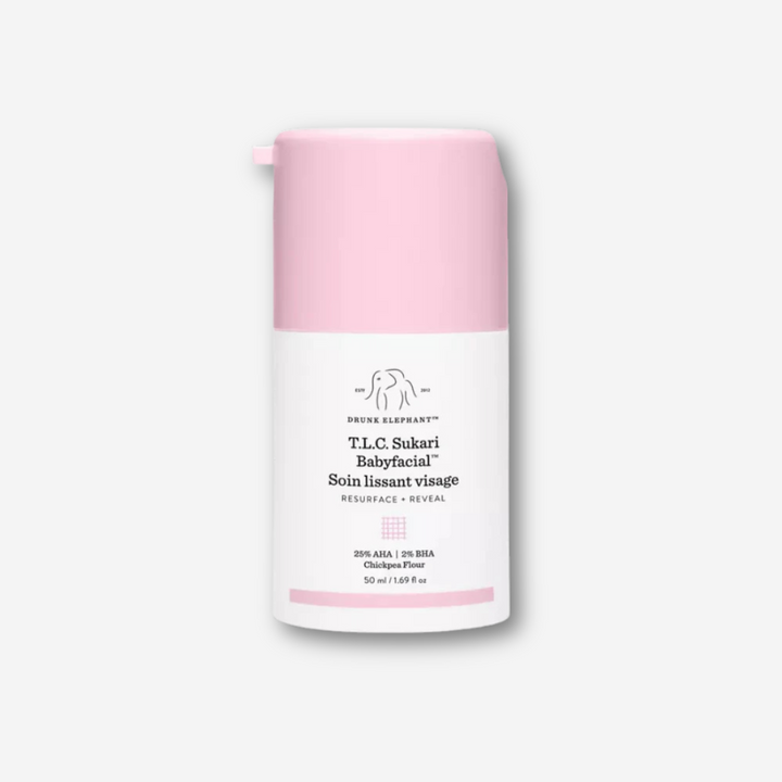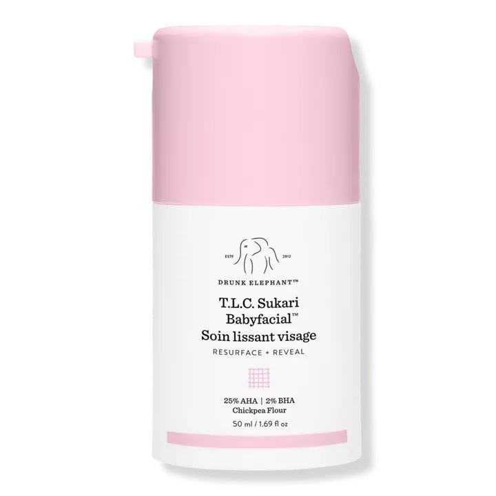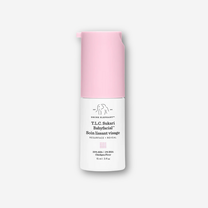 El Babyfacial de Drunk Elephant es un "facial" de calidad profesional con un 25% de AHA y un 2% de BHA que rejuvenece la piel para revelar una mayor claridad, una textura y un tono mejorados y una luminosidad de aspecto más juvenil.