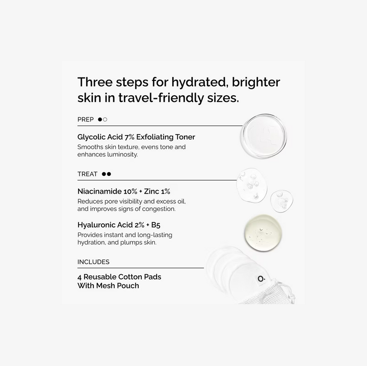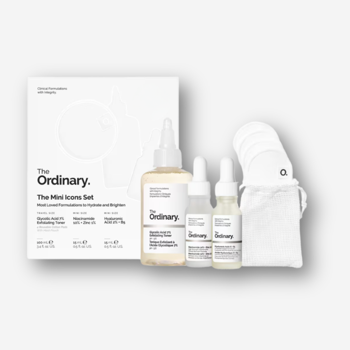 El set Mini Icons incluye tres tamaños en miniatura de algunas de nuestras fórmulas más populares, ideales para viajar. El set también incluye discos de algodón reutilizables de The Ordinary para facilitar la aplicación del tónico exfoliante con ácido glicólico al 7 %.