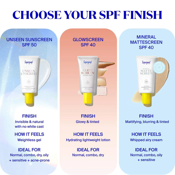 Qué más necesitas saber: Esta prebase invisible supercargada está clínicamente probada para mejorar la calidad del maquillaje y conseguir una mayor duración durante todo el día. Deja la piel perfectamente preparada para el maquillaje con un acabado natural que difumina visiblemente los poros sin efecto blanco. Unseen Sunscreen mejora la claridad de la piel para conseguir una piel más suave y es ideal para todo tipo de pieles, incluso las sensibles y propensas al acné, con una fórmula no acnegénica, no grasa y no irritante. Proporciona una protección FPS 50 de amplio espectro para ayudar a prevenir los signos visibles del envejecimiento.