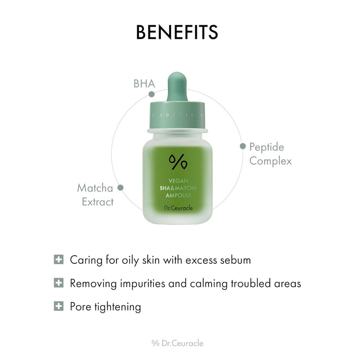 INGREDIENTES CLAVE – BHA y MATCHA: BHA ayuda a eliminar las impurezas y el exceso de sebo mientras exfolia dentro de los poros. Matcha, procedente de la isla de Jeju en Corea del Sur, ayuda a purificar y desintoxicar la piel.